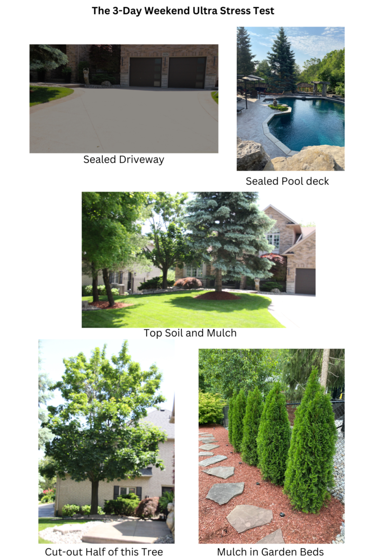 Over the course of a three-day weekend, we re-sealed our concrete driveway and the deck around the pool, spread 2 yards of topsoil on the lawn, and put 3 yards of mulch in the garden beds. I cut the extraneous branches off of a giant maple tree—which put me in some precarious positions.