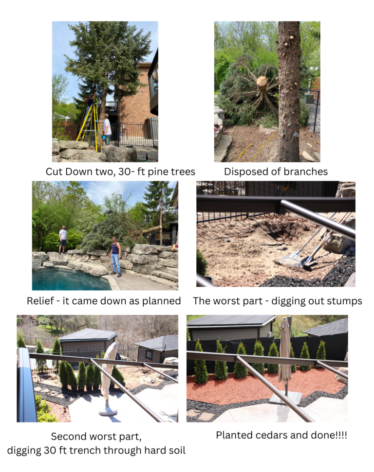 We also brought down two 35-foot pine trees, dug out the stumps, and then I pick-axed a 40-foot trench through hard soil to plant eight new emerald cedars.