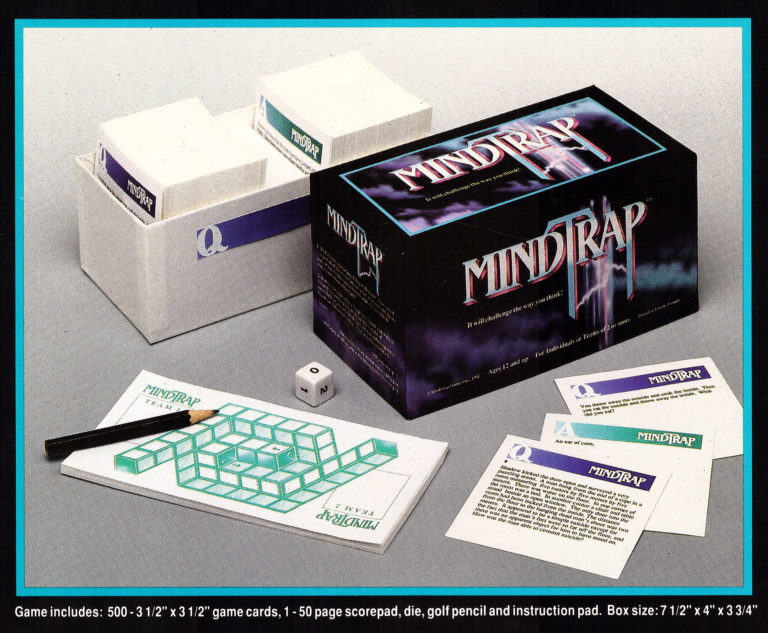 In fact, days before Christmas, I got a call from the president of CBC, who said his daughter had MindTrap at the top of her Christmas wish list. He had a problem, though; he couldn’t locate a game anywhere and wondered if I couldn’t be kind enough to get him a copy. When I told him all I had left was my promotional copy, which was a little beat up, he said he would gladly take it.