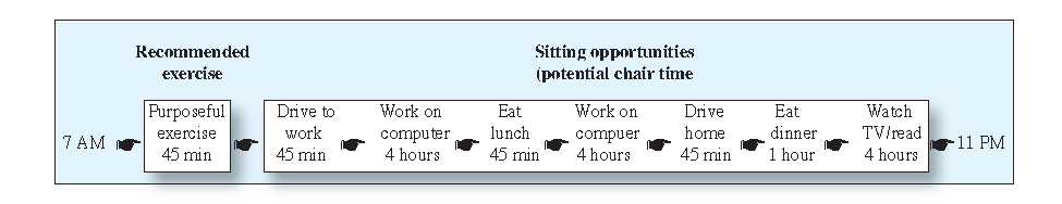 As you can see, for this hypothetical “physically active” adult, a forty-five-minute exercise session of brisk walking before work ensures that the recommended amount of exercise is achieved. However, this person then sits during the drive to work, before lunch, during lunch, at the computer after lunch, during the drive home, at dinner, and while watching TV. In fact, 95 percent of their hours are spent sitting. That much sitting has unique and damaging health implications entirely distinct from people getting “too little” exercise.