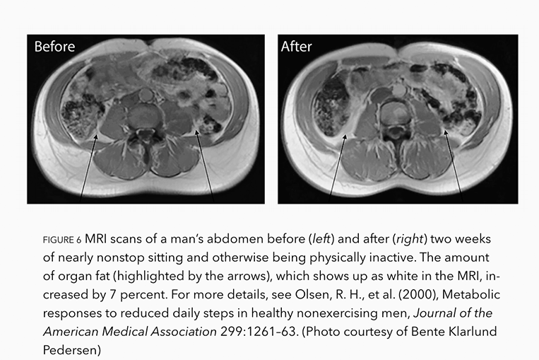 In one extraordinary experiment, Danish researchers paid a group of healthy young men to spend most of their day just sitting and restrict themselves to a maximum of 1500 steps a day for two whole weeks. Incredibly after just two weeks, they added an average of 7% more visceral fat to their organs, as indicated by the arrows in the Before and After photos.