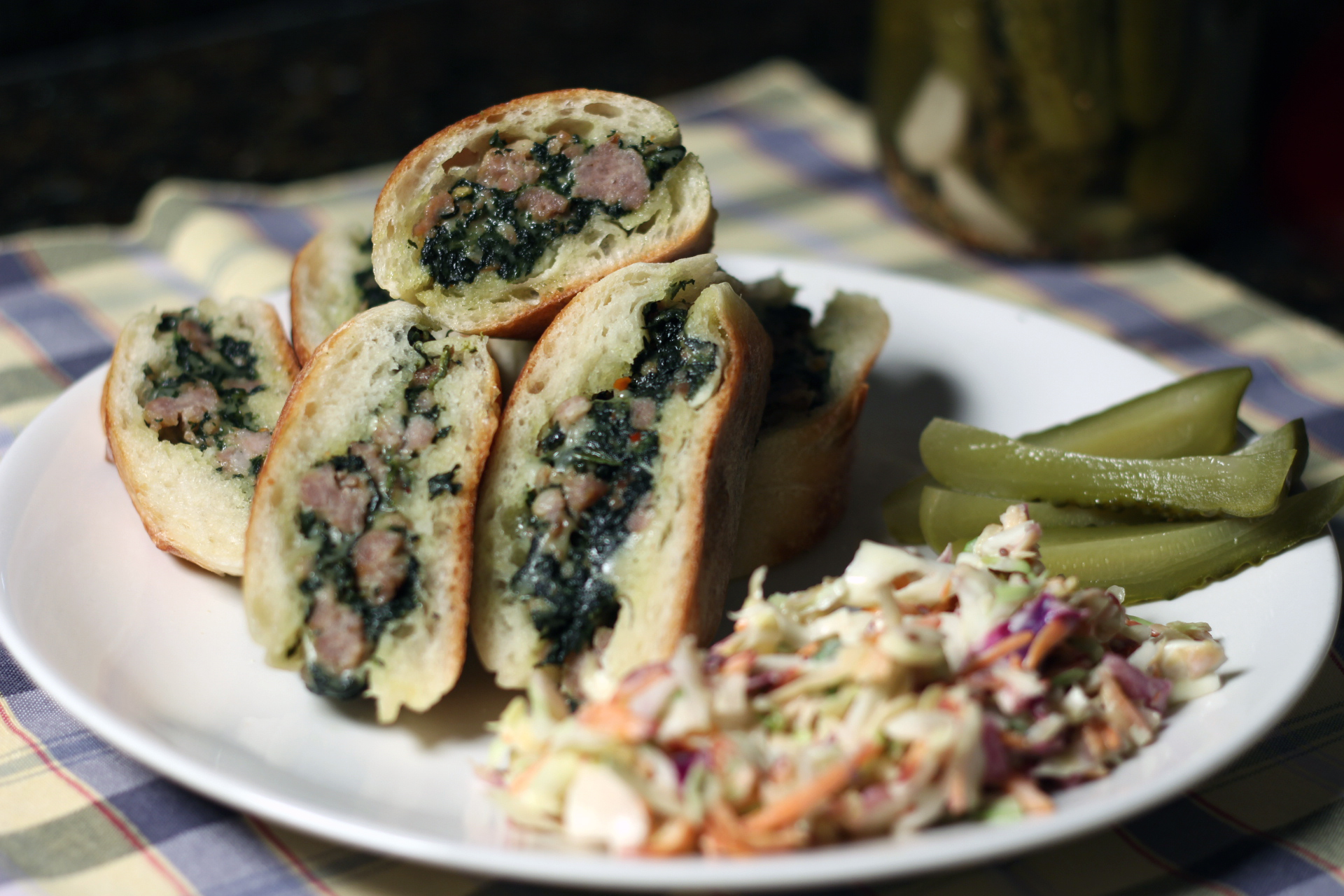 - Fill the hollow with the sausage mixture, and place the other half of the bread on top.