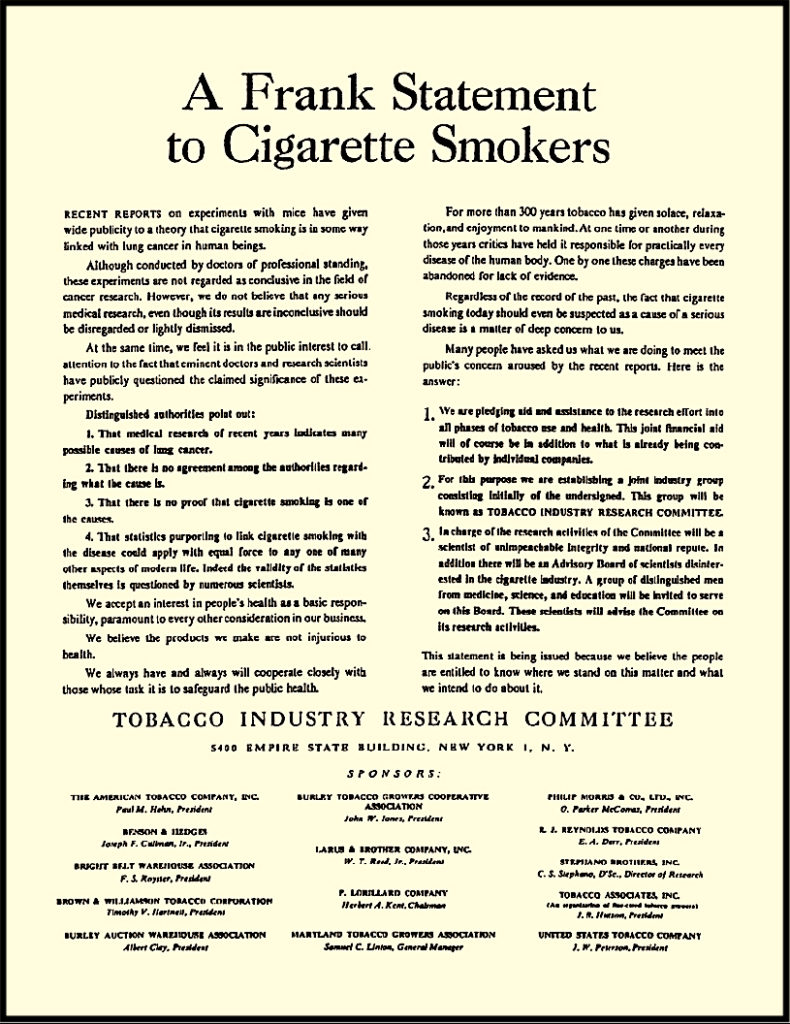 In response to this “catastrophe,” the CEOs of the major tobacco companies met secretly in New York City to discuss how they would counter the damage. From that meeting came the now-classic Frank Statement, which was published in 1954 in 448 newspapers.