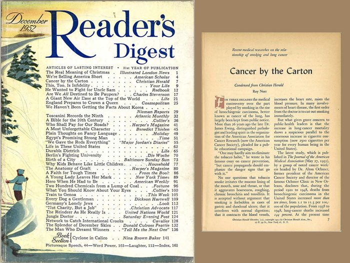 In the early 50s, scientific studies began to show a direct link between smoking and lung cancer. In 1952, Reader’s Digest – then the public’s leading source of medical information – printed an article entitled “Cancer by the Carton,” which made such a powerful impression that cigarette sales plummeted for two years.